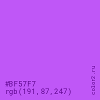 Цвет #BF57F7 в цветовой модели RGB обозначается тремя октетами (191, 87, 247) в десятичном формате и #BF57F7 в шестнадцатиричном (hex) формате, которые являются интенсивностью красного 191 (hex BF), интенсивность зелёного 87 (hex 57) и интенсивность синего 247 (hex F7).