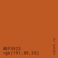 Цвет #BF5923 в цветовой модели RGB обозначается тремя октетами (191, 89, 35) в десятичном формате и #BF5923 в шестнадцатиричном (hex) формате, которые являются интенсивностью красного 191 (hex BF), интенсивность зелёного 89 (hex 59) и интенсивность синего 35 (hex 23).