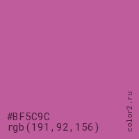 Цвет #BF5C9C в цветовой модели RGB обозначается тремя октетами (191, 92, 156) в десятичном формате и #BF5C9C в шестнадцатиричном (hex) формате, которые являются интенсивностью красного 191 (hex BF), интенсивность зелёного 92 (hex 5C) и интенсивность синего 156 (hex 9C).