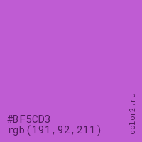 Цвет #BF5CD3 в цветовой модели RGB обозначается тремя октетами (191, 92, 211) в десятичном формате и #BF5CD3 в шестнадцатиричном (hex) формате, которые являются интенсивностью красного 191 (hex BF), интенсивность зелёного 92 (hex 5C) и интенсивность синего 211 (hex D3).
