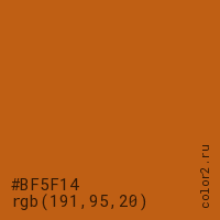 Цвет #BF5F14 в цветовой модели RGB обозначается тремя октетами (191, 95, 20) в десятичном формате и #BF5F14 в шестнадцатиричном (hex) формате, которые являются интенсивностью красного 191 (hex BF), интенсивность зелёного 95 (hex 5F) и интенсивность синего 20 (hex 14).