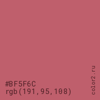 Цвет #BF5F6C в цветовой модели RGB обозначается тремя октетами (191, 95, 108) в десятичном формате и #BF5F6C в шестнадцатиричном (hex) формате, которые являются интенсивностью красного 191 (hex BF), интенсивность зелёного 95 (hex 5F) и интенсивность синего 108 (hex 6C).