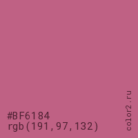 Цвет #BF6184 в цветовой модели RGB обозначается тремя октетами (191, 97, 132) в десятичном формате и #BF6184 в шестнадцатиричном (hex) формате, которые являются интенсивностью красного 191 (hex BF), интенсивность зелёного 97 (hex 61) и интенсивность синего 132 (hex 84).