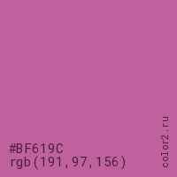 Цвет #BF619C в цветовой модели RGB обозначается тремя октетами (191, 97, 156) в десятичном формате и #BF619C в шестнадцатиричном (hex) формате, которые являются интенсивностью красного 191 (hex BF), интенсивность зелёного 97 (hex 61) и интенсивность синего 156 (hex 9C).