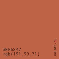 Цвет #BF6347 в цветовой модели RGB обозначается тремя октетами (191, 99, 71) в десятичном формате и #BF6347 в шестнадцатиричном (hex) формате, которые являются интенсивностью красного 191 (hex BF), интенсивность зелёного 99 (hex 63) и интенсивность синего 71 (hex 47).