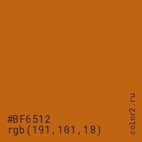 Цвет #BF6512 в цветовой модели RGB обозначается тремя октетами (191, 101, 18) в десятичном формате и #BF6512 в шестнадцатиричном (hex) формате, которые являются интенсивностью красного 191 (hex BF), интенсивность зелёного 101 (hex 65) и интенсивность синего 18 (hex 12).