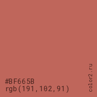 Цвет #BF665B в цветовой модели RGB обозначается тремя октетами (191, 102, 91) в десятичном формате и #BF665B в шестнадцатиричном (hex) формате, которые являются интенсивностью красного 191 (hex BF), интенсивность зелёного 102 (hex 66) и интенсивность синего 91 (hex 5B).