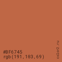 Цвет #BF6745 в цветовой модели RGB обозначается тремя октетами (191, 103, 69) в десятичном формате и #BF6745 в шестнадцатиричном (hex) формате, которые являются интенсивностью красного 191 (hex BF), интенсивность зелёного 103 (hex 67) и интенсивность синего 69 (hex 45).