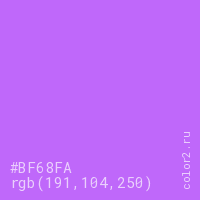 Цвет #BF68FA в цветовой модели RGB обозначается тремя октетами (191, 104, 250) в десятичном формате и #BF68FA в шестнадцатиричном (hex) формате, которые являются интенсивностью красного 191 (hex BF), интенсивность зелёного 104 (hex 68) и интенсивность синего 250 (hex FA).
