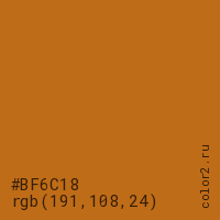 Цвет #BF6C18 в цветовой модели RGB обозначается тремя октетами (191, 108, 24) в десятичном формате и #BF6C18 в шестнадцатиричном (hex) формате, которые являются интенсивностью красного 191 (hex BF), интенсивность зелёного 108 (hex 6C) и интенсивность синего 24 (hex 18).