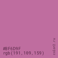 Цвет #BF6D9F в цветовой модели RGB обозначается тремя октетами (191, 109, 159) в десятичном формате и #BF6D9F в шестнадцатиричном (hex) формате, которые являются интенсивностью красного 191 (hex BF), интенсивность зелёного 109 (hex 6D) и интенсивность синего 159 (hex 9F).
