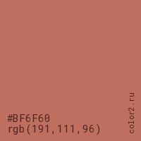 Цвет #BF6F60 в цветовой модели RGB обозначается тремя октетами (191, 111, 96) в десятичном формате и #BF6F60 в шестнадцатиричном (hex) формате, которые являются интенсивностью красного 191 (hex BF), интенсивность зелёного 111 (hex 6F) и интенсивность синего 96 (hex 60).