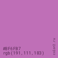 Цвет #BF6FB7 в цветовой модели RGB обозначается тремя октетами (191, 111, 183) в десятичном формате и #BF6FB7 в шестнадцатиричном (hex) формате, которые являются интенсивностью красного 191 (hex BF), интенсивность зелёного 111 (hex 6F) и интенсивность синего 183 (hex B7).