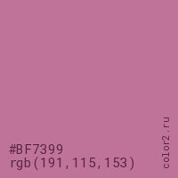 Цвет #BF7399 в цветовой модели RGB обозначается тремя октетами (191, 115, 153) в десятичном формате и #BF7399 в шестнадцатиричном (hex) формате, которые являются интенсивностью красного 191 (hex BF), интенсивность зелёного 115 (hex 73) и интенсивность синего 153 (hex 99).