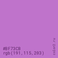 Цвет RGB(191, 115, 203) в процентом отношении количества цвета состоит из 74.9% красного (red), 45.1% зелёного (green) и 79.6% синего (blue).