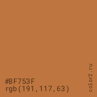Цвет #BF753F в цветовой модели RGB обозначается тремя октетами (191, 117, 63) в десятичном формате и #BF753F в шестнадцатиричном (hex) формате, которые являются интенсивностью красного 191 (hex BF), интенсивность зелёного 117 (hex 75) и интенсивность синего 63 (hex 3F).
