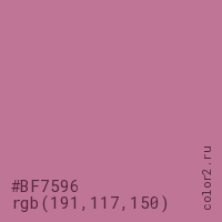 Цвет #BF7596 в цветовой модели RGB обозначается тремя октетами (191, 117, 150) в десятичном формате и #BF7596 в шестнадцатиричном (hex) формате, которые являются интенсивностью красного 191 (hex BF), интенсивность зелёного 117 (hex 75) и интенсивность синего 150 (hex 96).