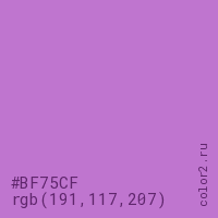 Цвет #BF75CF в цветовой модели RGB обозначается тремя октетами (191, 117, 207) в десятичном формате и #BF75CF в шестнадцатиричном (hex) формате, которые являются интенсивностью красного 191 (hex BF), интенсивность зелёного 117 (hex 75) и интенсивность синего 207 (hex CF).