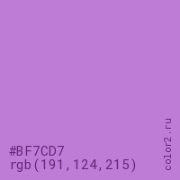 Цвет #BF7CD7 в цветовой модели RGB обозначается тремя октетами (191, 124, 215) в десятичном формате и #BF7CD7 в шестнадцатиричном (hex) формате, которые являются интенсивностью красного 191 (hex BF), интенсивность зелёного 124 (hex 7C) и интенсивность синего 215 (hex D7).