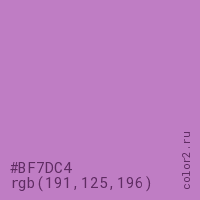 Цвет #BF7DC4 в цветовой модели RGB обозначается тремя октетами (191, 125, 196) в десятичном формате и #BF7DC4 в шестнадцатиричном (hex) формате, которые являются интенсивностью красного 191 (hex BF), интенсивность зелёного 125 (hex 7D) и интенсивность синего 196 (hex C4).