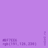 Цвет #BF7EE6 в цветовой модели RGB обозначается тремя октетами (191, 126, 230) в десятичном формате и #BF7EE6 в шестнадцатиричном (hex) формате, которые являются интенсивностью красного 191 (hex BF), интенсивность зелёного 126 (hex 7E) и интенсивность синего 230 (hex E6).