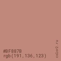Цвет #BF887B в цветовой модели RGB обозначается тремя октетами (191, 136, 123) в десятичном формате и #BF887B в шестнадцатиричном (hex) формате, которые являются интенсивностью красного 191 (hex BF), интенсивность зелёного 136 (hex 88) и интенсивность синего 123 (hex 7B).