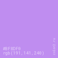 Цвет #BF8DF0 в цветовой модели RGB обозначается тремя октетами (191, 141, 240) в десятичном формате и #BF8DF0 в шестнадцатиричном (hex) формате, которые являются интенсивностью красного 191 (hex BF), интенсивность зелёного 141 (hex 8D) и интенсивность синего 240 (hex F0).