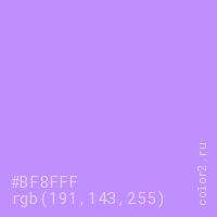 Цвет #BF8FFF в цветовой модели RGB обозначается тремя октетами (191, 143, 255) в десятичном формате и #BF8FFF в шестнадцатиричном (hex) формате, которые являются интенсивностью красного 191 (hex BF), интенсивность зелёного 143 (hex 8F) и интенсивность синего 255 (hex FF).