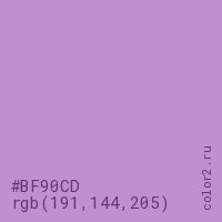 Цвет #BF90CD в цветовой модели RGB обозначается тремя октетами (191, 144, 205) в десятичном формате и #BF90CD в шестнадцатиричном (hex) формате, которые являются интенсивностью красного 191 (hex BF), интенсивность зелёного 144 (hex 90) и интенсивность синего 205 (hex CD).