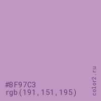 Цвет #BF97C3 в цветовой модели RGB обозначается тремя октетами (191, 151, 195) в десятичном формате и #BF97C3 в шестнадцатиричном (hex) формате, которые являются интенсивностью красного 191 (hex BF), интенсивность зелёного 151 (hex 97) и интенсивность синего 195 (hex C3).