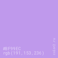 Цвет #BF99EC в цветовой модели RGB обозначается тремя октетами (191, 153, 236) в десятичном формате и #BF99EC в шестнадцатиричном (hex) формате, которые являются интенсивностью красного 191 (hex BF), интенсивность зелёного 153 (hex 99) и интенсивность синего 236 (hex EC).