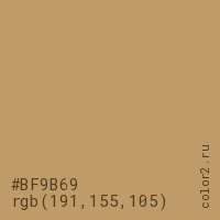 Цвет #BF9B69 в цветовой модели RGB обозначается тремя октетами (191, 155, 105) в десятичном формате и #BF9B69 в шестнадцатиричном (hex) формате, которые являются интенсивностью красного 191 (hex BF), интенсивность зелёного 155 (hex 9B) и интенсивность синего 105 (hex 69).