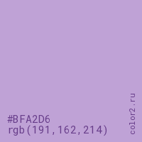 Цвет #BFA2D6 в цветовой модели RGB обозначается тремя октетами (191, 162, 214) в десятичном формате и #BFA2D6 в шестнадцатиричном (hex) формате, которые являются интенсивностью красного 191 (hex BF), интенсивность зелёного 162 (hex A2) и интенсивность синего 214 (hex D6).