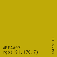 Цвет #BFAA07 в цветовой модели RGB обозначается тремя октетами (191, 170, 7) в десятичном формате и #BFAA07 в шестнадцатиричном (hex) формате, которые являются интенсивностью красного 191 (hex BF), интенсивность зелёного 170 (hex AA) и интенсивность синего 7 (hex 07).