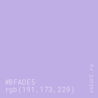Цвет #BFADE5 в цветовой модели RGB обозначается тремя октетами (191, 173, 229) в десятичном формате и #BFADE5 в шестнадцатиричном (hex) формате, которые являются интенсивностью красного 191 (hex BF), интенсивность зелёного 173 (hex AD) и интенсивность синего 229 (hex E5).