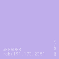 Цвет #BFADEB в цветовой модели RGB обозначается тремя октетами (191, 173, 235) в десятичном формате и #BFADEB в шестнадцатиричном (hex) формате, которые являются интенсивностью красного 191 (hex BF), интенсивность зелёного 173 (hex AD) и интенсивность синего 235 (hex EB).