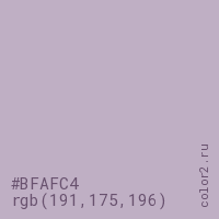 Цвет #BFAFC4 в цветовой модели RGB обозначается тремя октетами (191, 175, 196) в десятичном формате и #BFAFC4 в шестнадцатиричном (hex) формате, которые являются интенсивностью красного 191 (hex BF), интенсивность зелёного 175 (hex AF) и интенсивность синего 196 (hex C4).