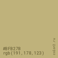 Цвет #BFB27B в цветовой модели RGB обозначается тремя октетами (191, 178, 123) в десятичном формате и #BFB27B в шестнадцатиричном (hex) формате, которые являются интенсивностью красного 191 (hex BF), интенсивность зелёного 178 (hex B2) и интенсивность синего 123 (hex 7B).