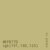 Цвет #BFB77D в цветовой модели RGB обозначается тремя октетами (191, 183, 125) в десятичном формате и #BFB77D в шестнадцатиричном (hex) формате, которые являются интенсивностью красного 191 (hex BF), интенсивность зелёного 183 (hex B7) и интенсивность синего 125 (hex 7D).