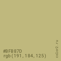 Цвет #BFB87D в цветовой модели RGB обозначается тремя октетами (191, 184, 125) в десятичном формате и #BFB87D в шестнадцатиричном (hex) формате, которые являются интенсивностью красного 191 (hex BF), интенсивность зелёного 184 (hex B8) и интенсивность синего 125 (hex 7D).