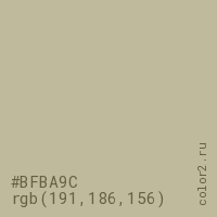 Цвет #BFBA9C в цветовой модели RGB обозначается тремя октетами (191, 186, 156) в десятичном формате и #BFBA9C в шестнадцатиричном (hex) формате, которые являются интенсивностью красного 191 (hex BF), интенсивность зелёного 186 (hex BA) и интенсивность синего 156 (hex 9C).