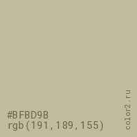 Цвет #BFBD9B в цветовой модели RGB обозначается тремя октетами (191, 189, 155) в десятичном формате и #BFBD9B в шестнадцатиричном (hex) формате, которые являются интенсивностью красного 191 (hex BF), интенсивность зелёного 189 (hex BD) и интенсивность синего 155 (hex 9B).