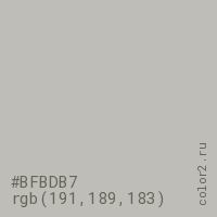 Цвет #BFBDB7 в цветовой модели RGB обозначается тремя октетами (191, 189, 183) в десятичном формате и #BFBDB7 в шестнадцатиричном (hex) формате, которые являются интенсивностью красного 191 (hex BF), интенсивность зелёного 189 (hex BD) и интенсивность синего 183 (hex B7).