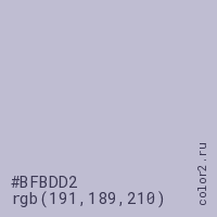 Цвет #BFBDD2 в цветовой модели RGB обозначается тремя октетами (191, 189, 210) в десятичном формате и #BFBDD2 в шестнадцатиричном (hex) формате, которые являются интенсивностью красного 191 (hex BF), интенсивность зелёного 189 (hex BD) и интенсивность синего 210 (hex D2).