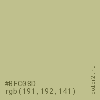 Цвет #BFC08D в цветовой модели RGB обозначается тремя октетами (191, 192, 141) в десятичном формате и #BFC08D в шестнадцатиричном (hex) формате, которые являются интенсивностью красного 191 (hex BF), интенсивность зелёного 192 (hex C0) и интенсивность синего 141 (hex 8D).