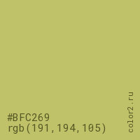 Цвет #BFC269 в цветовой модели RGB обозначается тремя октетами (191, 194, 105) в десятичном формате и #BFC269 в шестнадцатиричном (hex) формате, которые являются интенсивностью красного 191 (hex BF), интенсивность зелёного 194 (hex C2) и интенсивность синего 105 (hex 69).