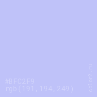 Цвет #BFC2F9 в цветовой модели RGB обозначается тремя октетами (191, 194, 249) в десятичном формате и #BFC2F9 в шестнадцатиричном (hex) формате, которые являются интенсивностью красного 191 (hex BF), интенсивность зелёного 194 (hex C2) и интенсивность синего 249 (hex F9).