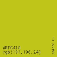 Цвет #BFC418 в цветовой модели RGB обозначается тремя октетами (191, 196, 24) в десятичном формате и #BFC418 в шестнадцатиричном (hex) формате, которые являются интенсивностью красного 191 (hex BF), интенсивность зелёного 196 (hex C4) и интенсивность синего 24 (hex 18).