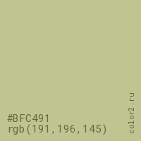 Цвет #BFC491 в цветовой модели RGB обозначается тремя октетами (191, 196, 145) в десятичном формате и #BFC491 в шестнадцатиричном (hex) формате, которые являются интенсивностью красного 191 (hex BF), интенсивность зелёного 196 (hex C4) и интенсивность синего 145 (hex 91).