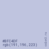 Цвет #BFC4DF в цветовой модели RGB обозначается тремя октетами (191, 196, 223) в десятичном формате и #BFC4DF в шестнадцатиричном (hex) формате, которые являются интенсивностью красного 191 (hex BF), интенсивность зелёного 196 (hex C4) и интенсивность синего 223 (hex DF).
